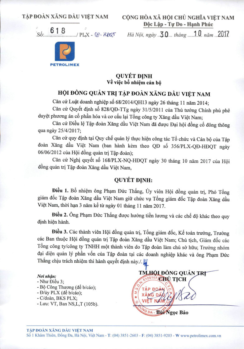 Quyết định bổ nhiệm ông Phạm Đức Thắng giữ chức vụ Tổng giám đốc Petrolimex