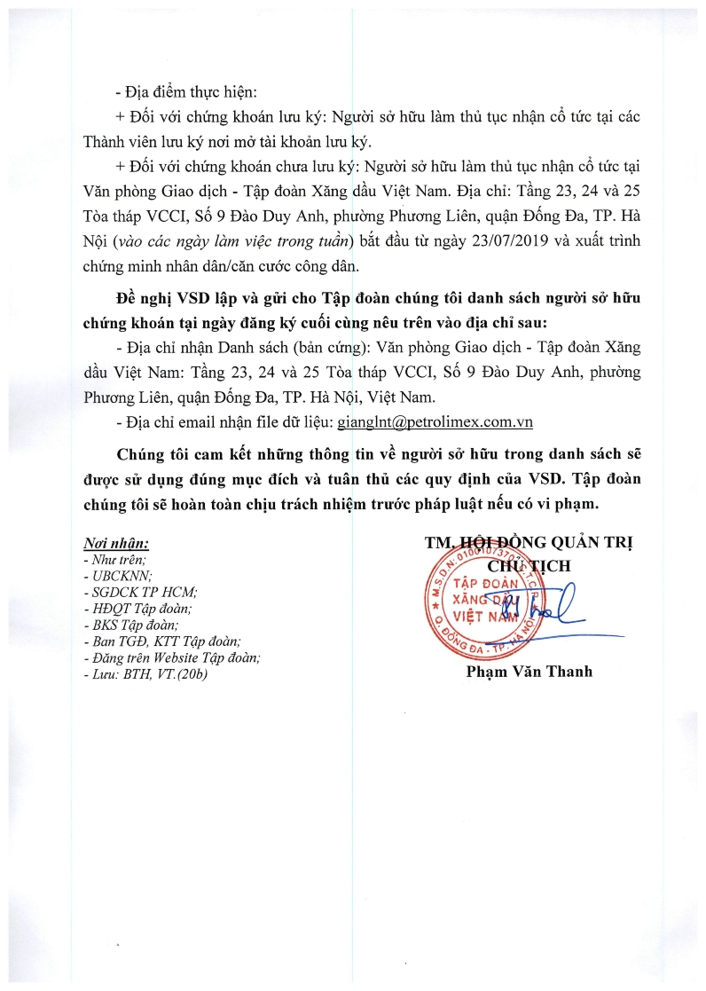 Ngày đăng ký cuối cùng để thực hiện quyền nhận cổ tức năm 2018